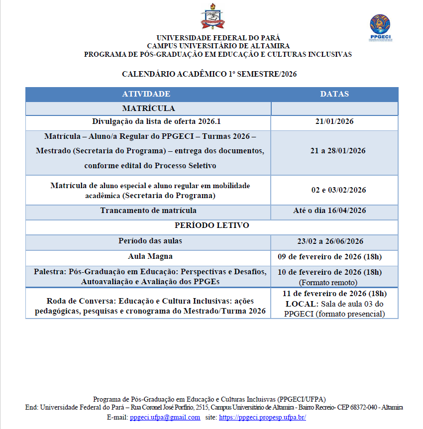 Calendário de Oferta 2026.1 em PDF - Clique aqui Para acessar o cronogramas das aulas do 1º Semestre clique no link abaixo: Cronograma de disciplinas 2026/1 em PDF - Clique aqui